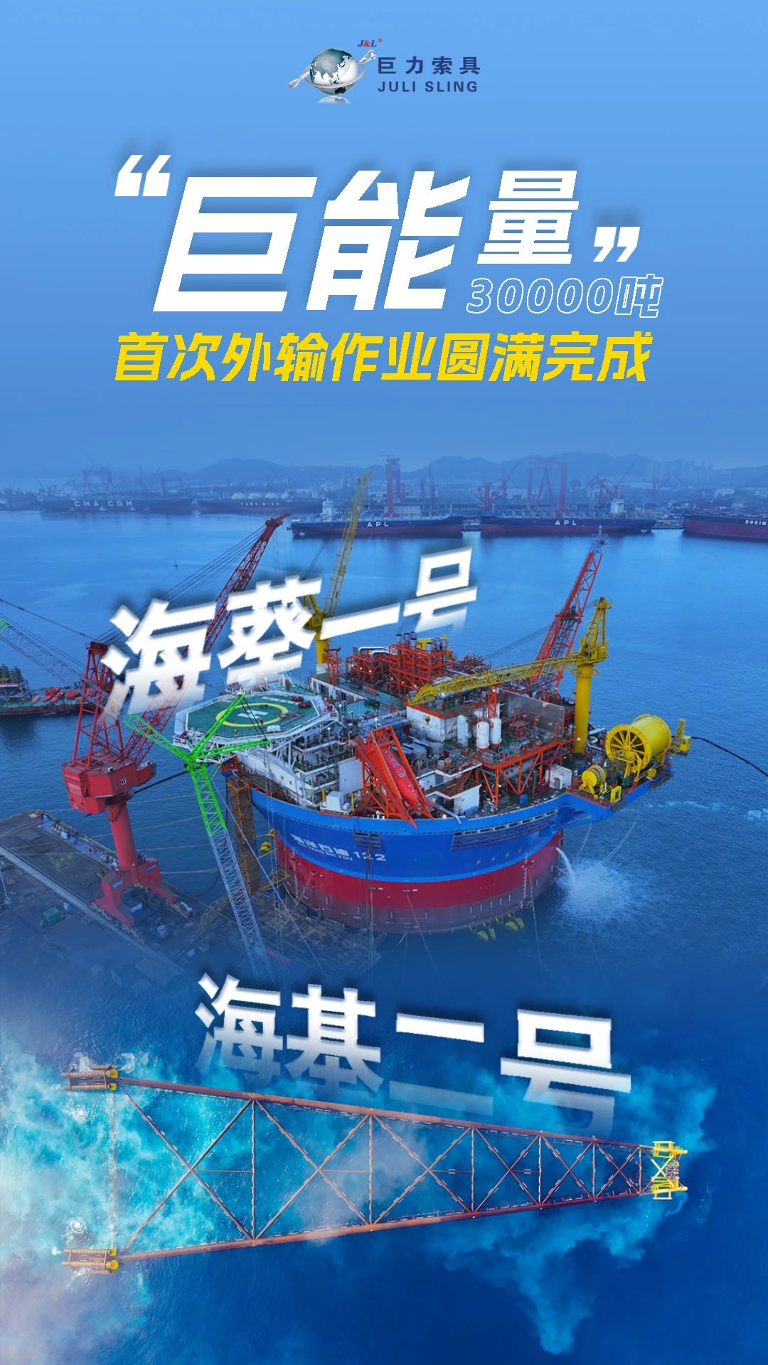 同时,巨力索具承当了“海基二号”的吊装任务。2024年3月,“海基二号”作为亚洲第一深水导管架,是亚洲高度最高、分量最大的导管架。巨力索具经由过程环形无讨论绳圈等高机能产物,确保了导管架在深海中的不变和宁静,缔造了牢固式陆地平台分量、高度、功课深度等多项亚洲记载。