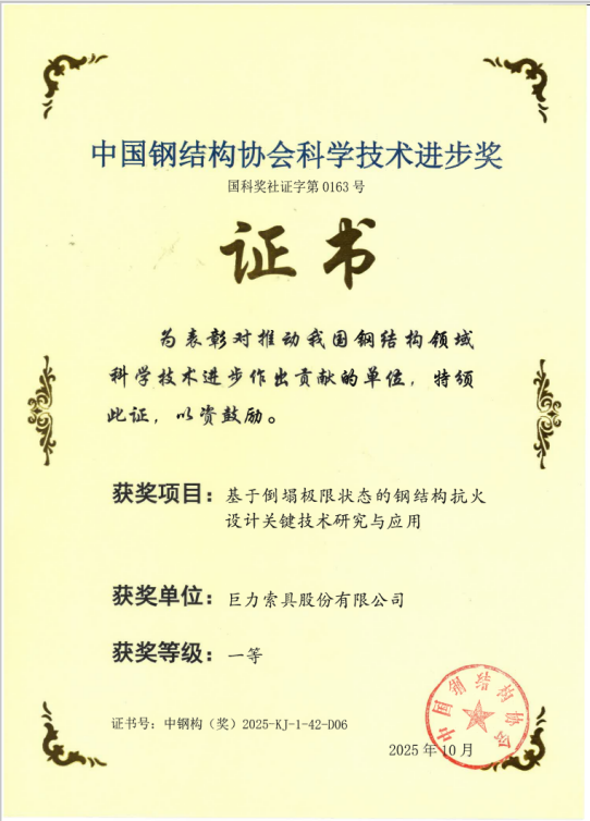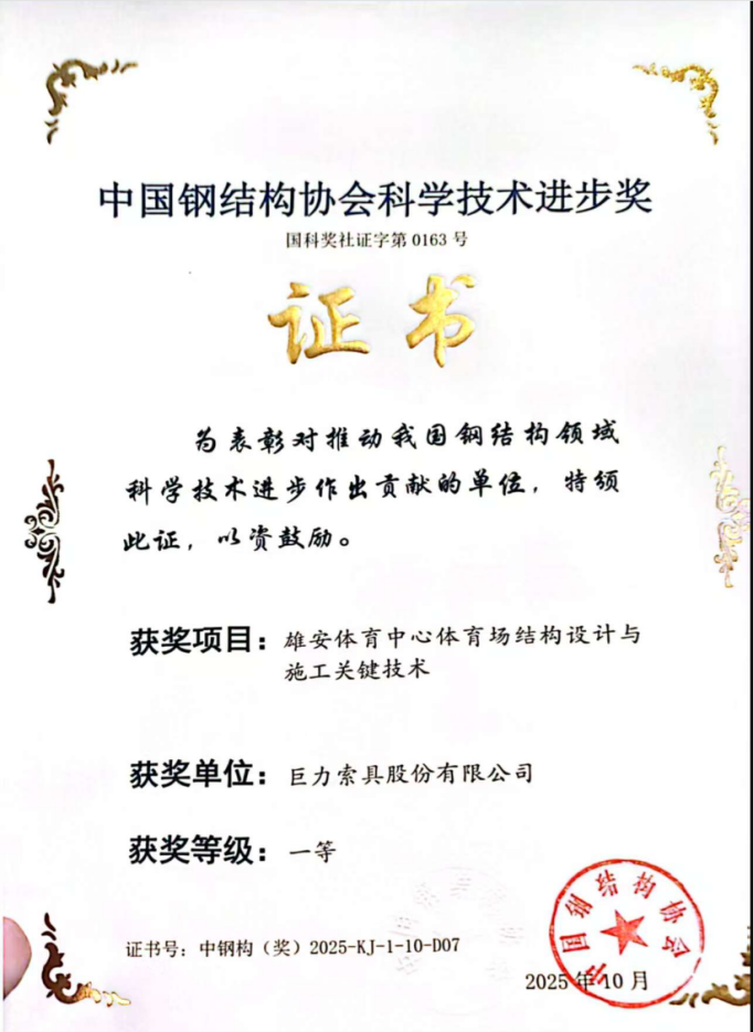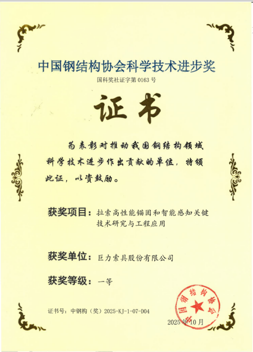 手艺立异再获权势巨子承认!巨力索具荣膺三项中国钢布局协会迷信手艺前进奖一等奖