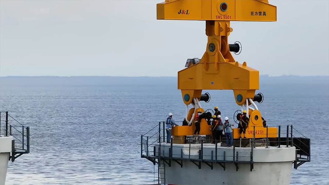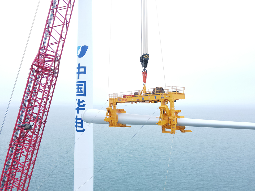 由巨力索具为国家国际船舶整体海装风电设备股分无限小工司出产地做成的5MW船上单叶尖吊具在福建平潭吊运美好幸福胜利者。