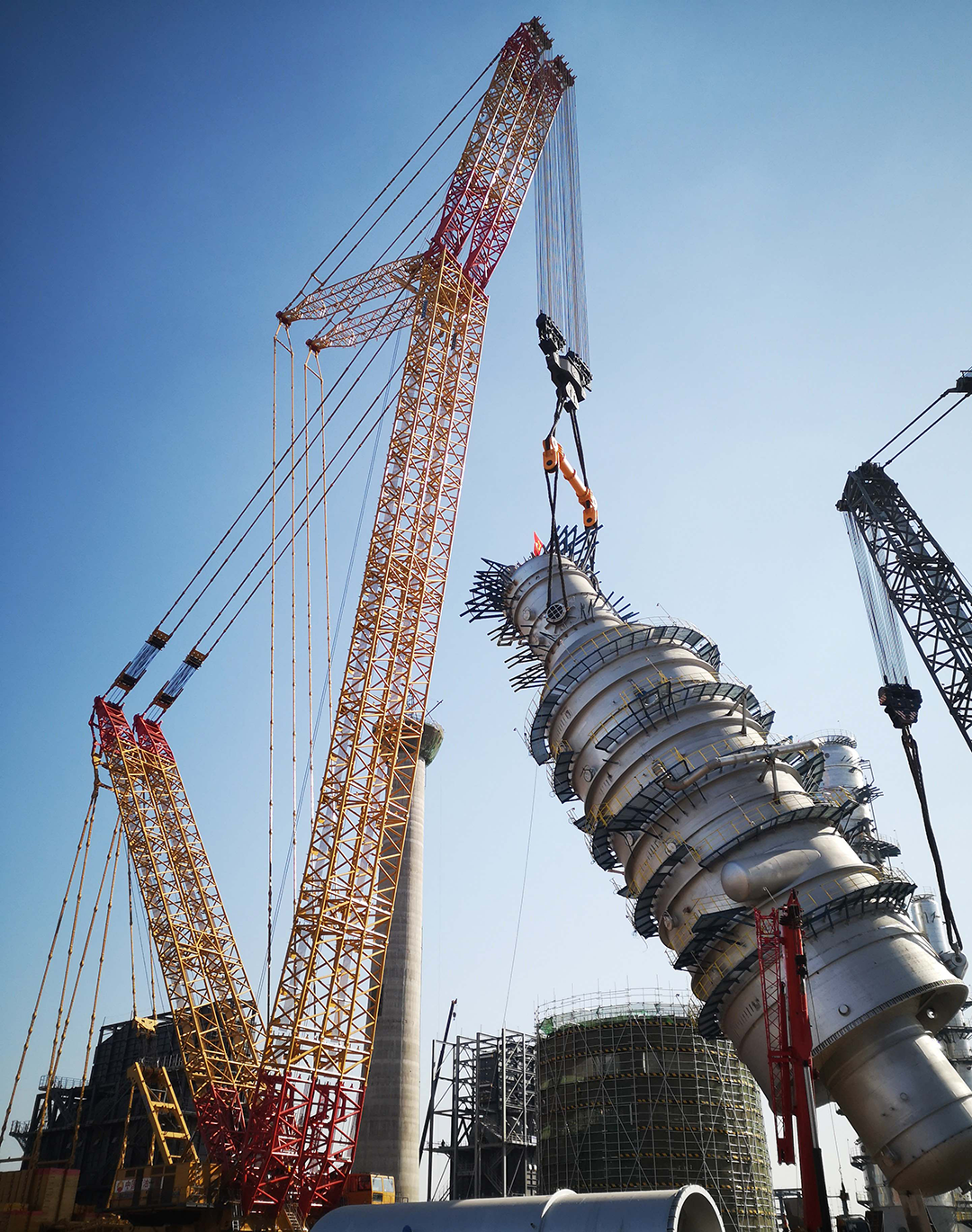 ꦇ巨力索具的2000t级均衡梁、无讨论绳圈,将盛虹炼化一体化名目常减压蒸馏装配中直径14米,高58米,吊重1717吨的减压塔顺遂吊装就位。