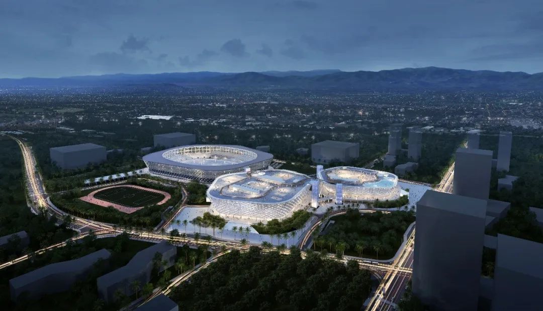 运动场钢布局屋盖接纳轮辐式索桁架布局,外侧为支持于内压环、外压环柱顶的程度安排的立体环桁架布局,由轮辐式拉索、竖杆、PTFE膜及环桁架构成。表里环轴外形为卵形,悬挑长度45米,索周边支承于核心钢布局内环梁上。核心钢布局最大跨度约39米。